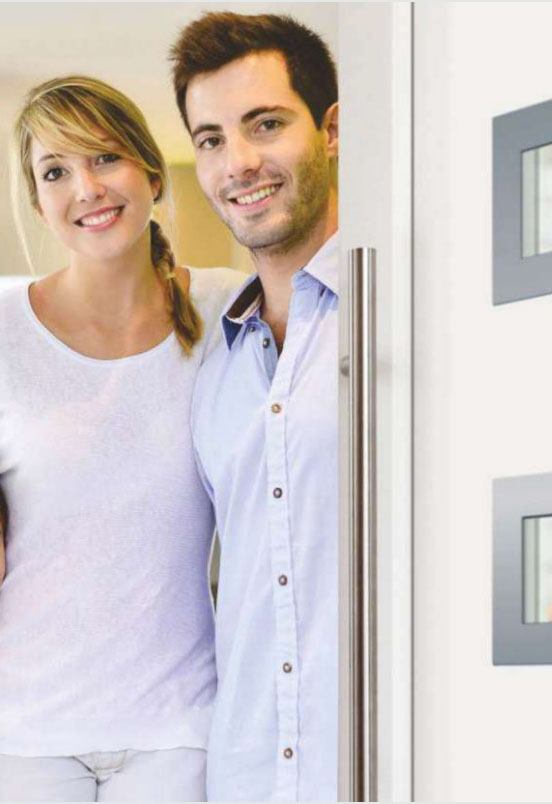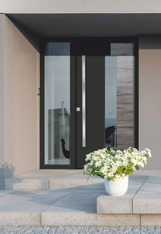 Vinyl entrance doors are made from quality profiles of the German manufacturer SCHÜCO. Two entrance door profile systems are available: the standard CORONA CT 70 and the more energy-efficient LivIng AS. The vinyl profiles have corrosion-protected metal reinforcements.